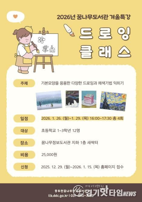 [경기핫타임뉴스=김형철 기자] 동두천시 도서문화사업소 꿈나무정보도서관은 초등학생을 대상으로 한 2026년 겨울방학 특강 프로그램을 운영한다고 밝혔다.
