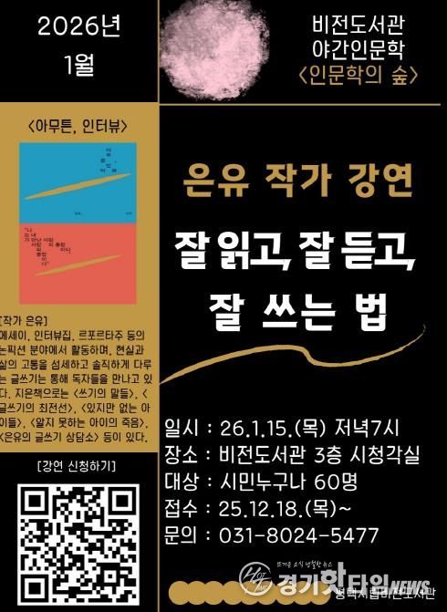 [경기핫타임뉴스=김삼영 기자] 평택시 비전도서관은 다음 달 1월 15일 저녁 7시 은유 작가를 초청하여 ‘잘 읽고, 잘 듣고, 잘 쓰는 법’을 주제로 야간 인문학 강연을 진행한다.