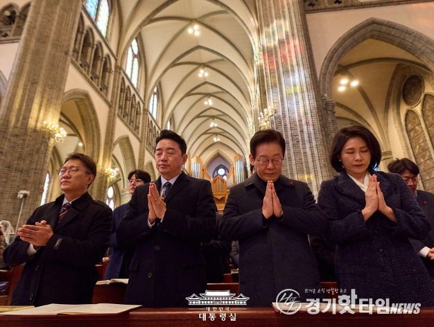 [경기핫타임뉴스=김삼영 기자] 이재명 대통령과 김혜경 여사가 25일 서울 중구 명동대성당에서 열린 성탄 대축일 미사에서 기도를 하고 있다.