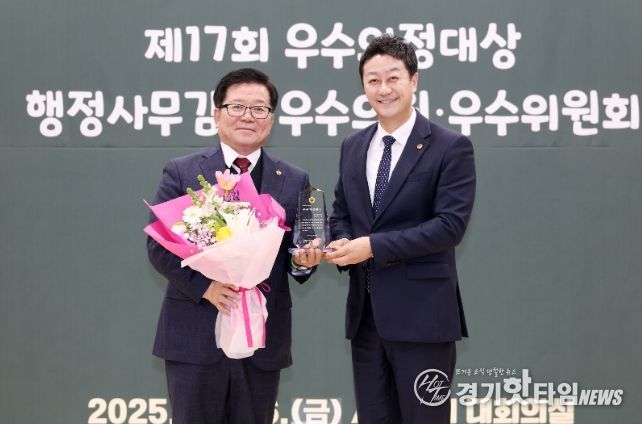 [경기핫타임뉴스=김삼영 기자] 경기도의회 건설교통위원회 허원 위원장(국민의힘, 이천2)은 26일 경기도의회 대회의실에서 열린 ‘2025년 경기도의회 시상식’에서 대한민국시도의회의장협의회가 수여하는 ‘제17회 우수의정대상’을 수상했다.