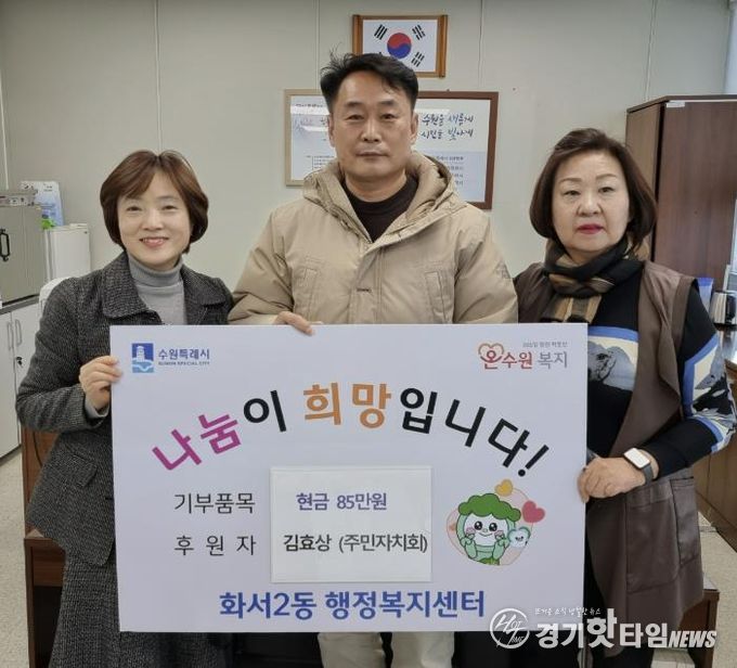 김효상 대표는 화서2동 주민자치회 문화복지분과장으로 활동하며, 평소 지역 주민의 복지 증진과 공동체 활성화를 위한 다양한 사업과 활동에 적극 참여해 왔다. 연말을 맞아 이웃을 위한 나눔을 직접 실천하고자 이번 성금 기부를 결정했으며, 특히 주민자치회 구성원으로서 지역사회에 대한 책임과 연대의 가치를 몸소 실천했다는 점에서 의미가 크다.