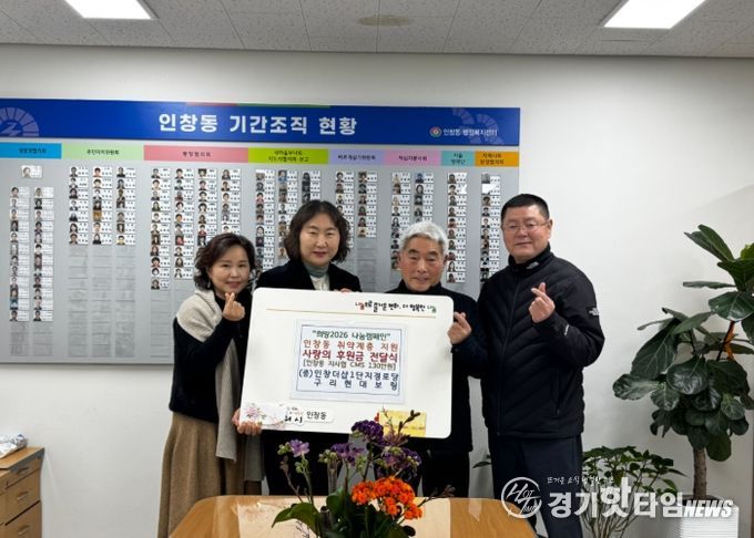 [경기핫타임뉴스=김형철 기자] 구리시 인창동 행정복지센터는 지난 12월 29일, 인창동 더샵그린포레1단지 경로당과 구리현대보링으로부터 취약계층 지원을 위한 후원금 130만 원을 지정 기탁받았다고 밝혔다.