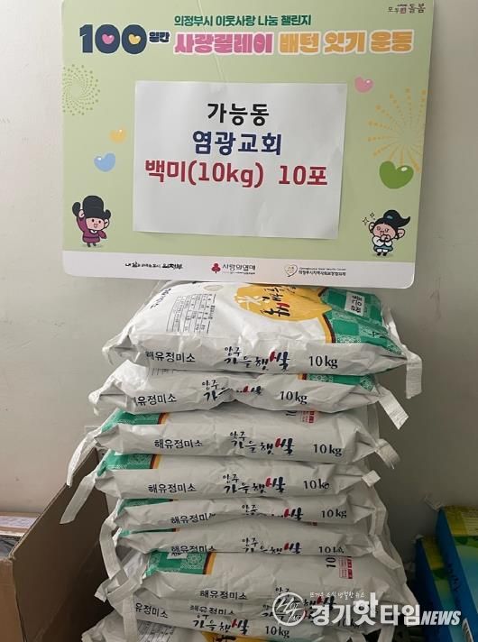 [경기핫타임뉴스=김형철 기자] 의정부시 가능동주민센터는 12월 26일 의정부 염광교회가 연말을 맞아 백미 10포(10kg 단위)를 기탁하며 ‘100일간 사랑릴레이 배턴 잇기’에 동참했다고 밝혔다.
