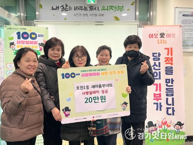 [경기핫타임뉴스=김형철 기자] 의정부시 호원1동주민센터는 12월 18일 호원1동 새마을부녀회가 관내 어려운 이웃을 위해 ‘100일간 사랑릴레이 배턴 잇기’에 동참해 성금 20만 원을 기탁했다고 밝혔다.