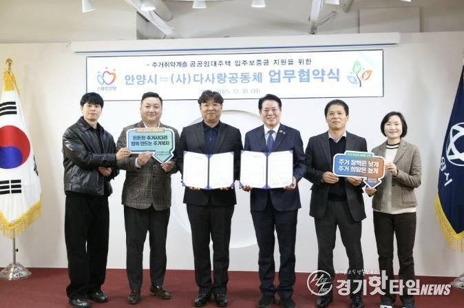 [경기핫타임뉴스=김삼영 기자] 안양시는 30일 오전 10시 시청 3층 접견실에서 (사)다사랑공동체와 ‘주거취약계층 공공임대주택 입주보증금 지원을 위한 업무협약’을 체결했다.