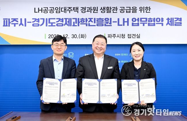 [경기핫타임뉴스=김형철 기자] 파주시는 30일 경기도경제과학진흥원, 한국토지주택공사 경기북부지역본부와 경과원 파주시 이전에 따른 엘에이치(LH) 공공임대주택 생활관 지원을 위한 업무협약을 체결했다고 밝혔다.