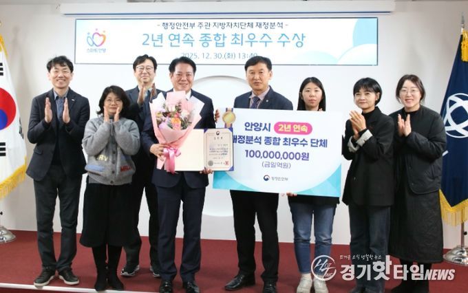 [경기핫타임뉴스=김삼영 기자] 안양시는 행정안전부에서 실시한‘2025년(2024 회계연도) 지방재정분석’에서 종합점수 ‘가’등급을 받아 2년 연속‘종합 최우수’지자체로 선정됐다.
