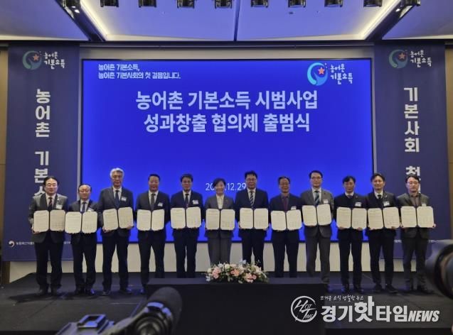 행사에서는 기본사회 강연을 시작으로 농어촌기본소득 시범사업 추진계획과 지역별 특화모델 운영 방향, 연구단 구성·운영 및 정책평가 계획이 공유됐다. 이어 농식품부–경인사연–10개 군이 참여하는 업무협약 체결과 협의체 출범 퍼포먼스, 기념촬영이 진행됐다.