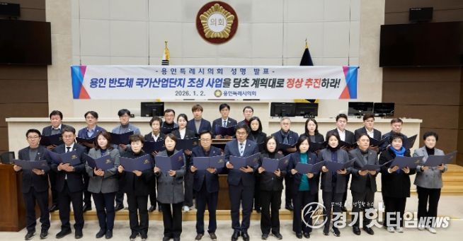[경기핫타임뉴스=김삼영 기자] 용인특례시의회는 2일 본회의장에서 ‘국가 경쟁력 강화 및 첨단 전략산업 육성을 위한 용인 반도체 국가산업단지 조성 사업 관철 성명서’를 발표하고, 사업의 당초 계획에 따른 정상 추진을 정부에 강력히 촉구했다.
