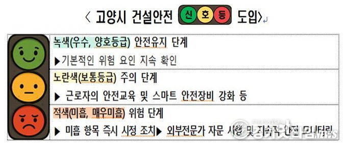 [경기핫타임뉴스=김형철 기자] 고양특례시가 관내 건설공사장의 안전관리를 강화하기 위해 ‘건설안전 신호등’을 도입하고, 안전관리 우수 건설 현장을 선정·확산하는 정책을 본격 추진한다.
