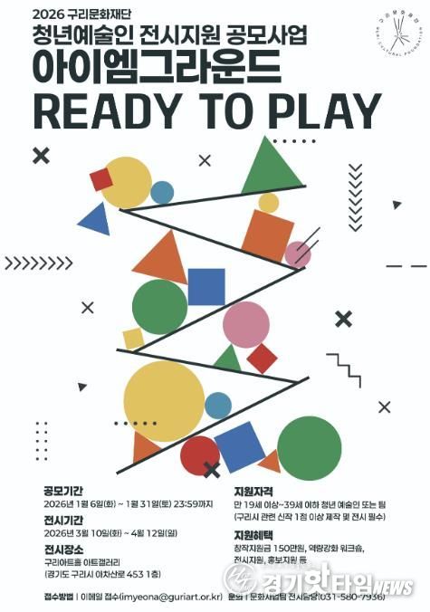 [경기핫타임뉴스=김형철 기자] (재)구리문화재단은 청년 예술인의 도약과 성장을 지원하기 위한 청년 정책 플랫폼 사업의 일환으로, 2026년 청년 예술인 전시지원 공모사업 '아이엠 그라운드, Ready to Play'에 참여할 예술인을 1월 6일부터 1월 31일까지 모집한다.