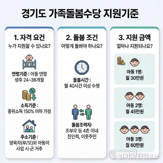 신청은 매월 1일부터 15일까지 경기민원24를 통해 온라인으로 가능하며, 돌봄활동 후 그다음 달에 수당이 지급된다.