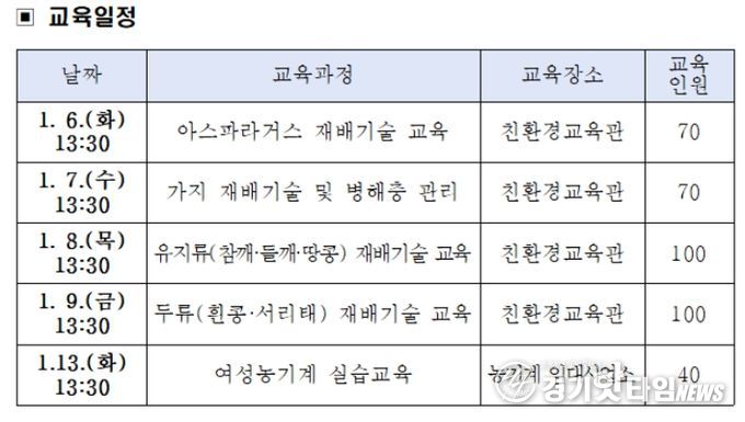 [경기핫타임뉴스=김형철 기자] 여주시는 오는 1월 6일부터 13일까지 '2026년 새해농업인실용교육'의 일환으로 밭작물 분야 전문교육을 본격 추진한다고 밝혔다.