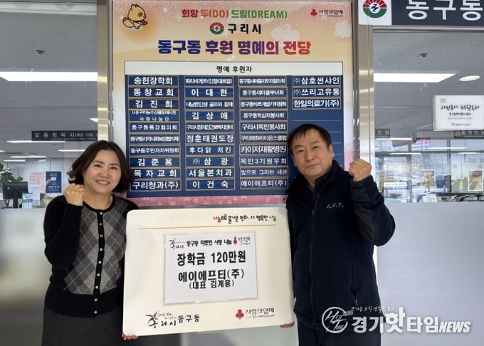 [경기핫타임뉴스=김형철 기자] 구리시 동구동 행정복지센터는 6일, 에이에프티㈜로부터 취약계층 대학생을 위한 장학금 120만 원을 기탁받았다고 밝혔다.