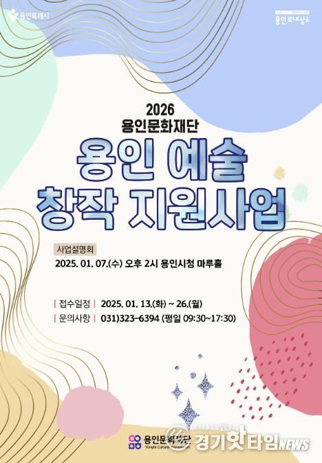 [경기핫타임뉴스=김삼영 기자] 용인문화재단은 기존'문화 예술 공모 지원사업'을 전면 개편하고, 사업명을 ‘2026 용인 예술 창작 지원’으로 변경해 새롭게 전환한다고 밝혔다. 이번 사업은 지난 6일 공고됐으며, 1월 13일부터 26일까지 접수를 통해 총 6억 400만 원의 지원금을 사업 유형과 규모에 따라 차등 지원할 예정이다.