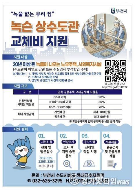 신청 기간은 올해 11월 말까지이며, 예산 소진 시 조기 마감될 수 있다. 지원을 원하는 시민은 부천시 수도자원국 수도시설과(032-625-3295, 3291)로 전화하거나 방문해 접수하면 된다. 자세한 사항은 부천시 홈페이지 ‘새소식’ 게시판에서 확인할 수 있으며, 안내 포스터의 큐알(QR)코드를 통해서도 접속 가능하다.
