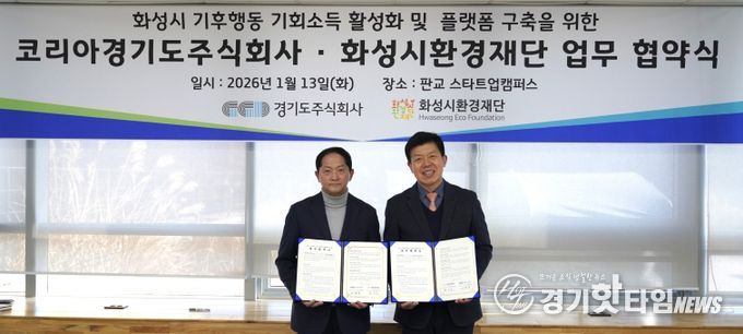 [경기핫타임뉴스=김삼영 기자] 경기도주식회사는 13일 경기도 성남시 판교 스타트업캠퍼스에서 화성시환경재단과 ‘기후행동 기회소득 활성화 및 화성시 플랫폼 구축을 위한 업무협약’을 체결했다.
