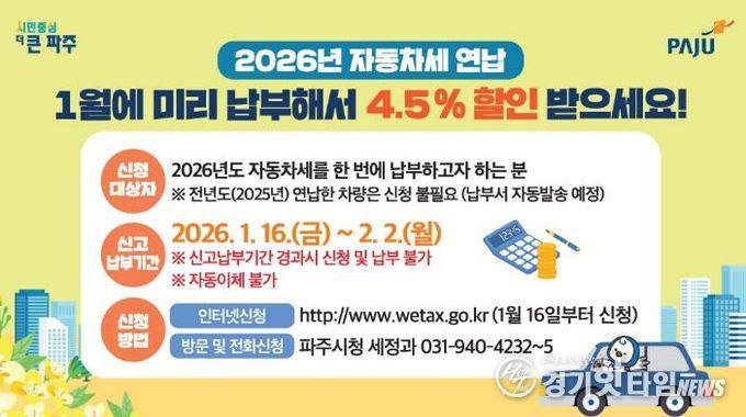 [경기핫타임뉴스=김형철 기자] 파주시는 2026년도 자동차세를 1월에 한 번에 납부하는 경우 세액공제 혜택을 받을 수 있는 자동차세 연납 신청·납부를 2월 2일까지 접수한다고 밝혔다.