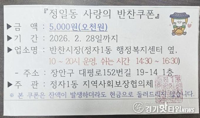 [경기핫타임뉴스=김삼영 기자] 수원시 장안구 정자1동 지역사회보장협의체는 금년부터 관내 취약계층 가구를 대상으로 매월 5가구에 2만원 상당의 반찬쿠폰을 지급하는 사업을 시작한다고 지난 13일 밝혔다.