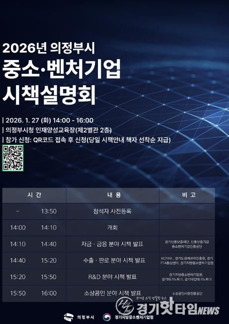 [경기핫타임뉴스=김형철 기자] 의정부시는 ‘2026년 중소‧벤처기업 시책설명회’에 참가할 지역 중소‧벤처기업인을 1월 26일까지 모집한다.