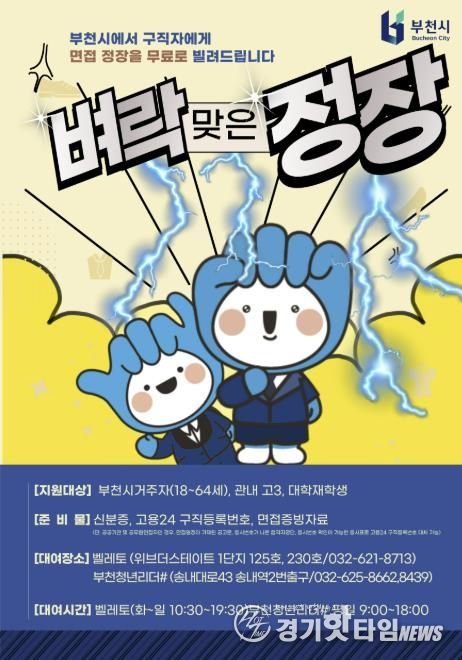 [경기핫타임뉴스=김형철 기자] 부천시는 취업을 준비하는 시민의 경제적 부담을 덜기 위해 ‘벼락 맞은 정장’ 면접정장 무료 대여사업을 지난해에 이어 올해도 지속 운영한다고 13일 밝혔다.