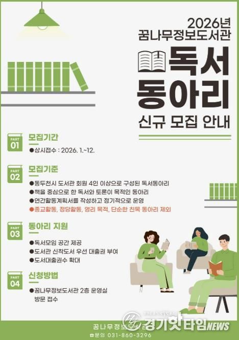 [경기핫타임뉴스=김형철 기자] 동두천시 도서문화사업소 꿈나무정보도서관은 시민들의 인문적 사고력 향상과 토론 문화 활성화를 위해 2026년 신규 독서동아리를 모집한다고 밝혔다.