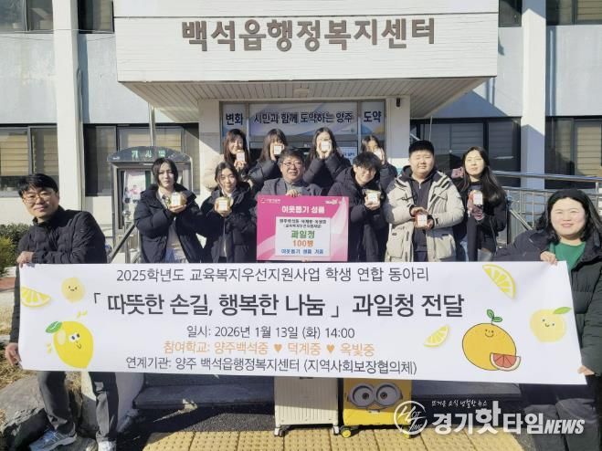 [경기핫타임뉴스=김형철 기자] 양주시 백석중학교, 덕계중학교, 옥빛중학교가 함께하는 교육복지우선지원사업 학생 연합 동아리가 지역사회를 위한 따뜻한 나눔을 실천했다.
