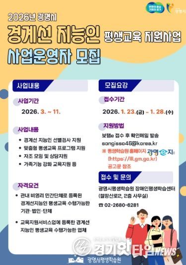 [경기핫타임뉴스=김삼영 기자] 광명시는 ‘2026년 광명시 경계선지능인 평생교육 운영 지원사업’을 수행할 보조사업자를 오는 28일까지 공개 모집한다.