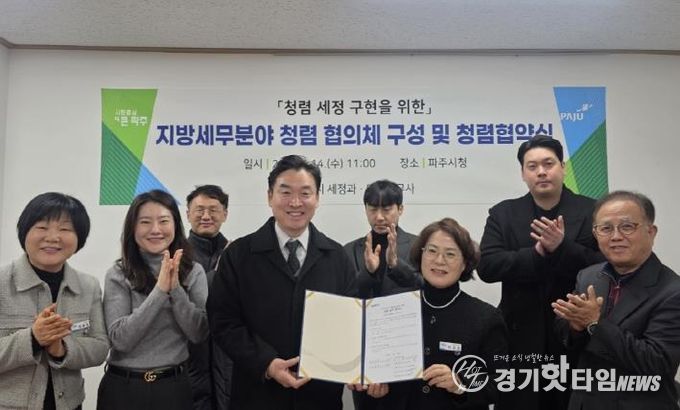 [경기핫타임뉴스=김형철 기자] 파주시는 지난 14일 파주지역세무사회(마을세무사)와 함께 청렴 문화의 정착과 확산을 위한 민관 청렴협의체를 구성하고, 청렴 실천을 위한 협약을 체결했다고 밝혔다.