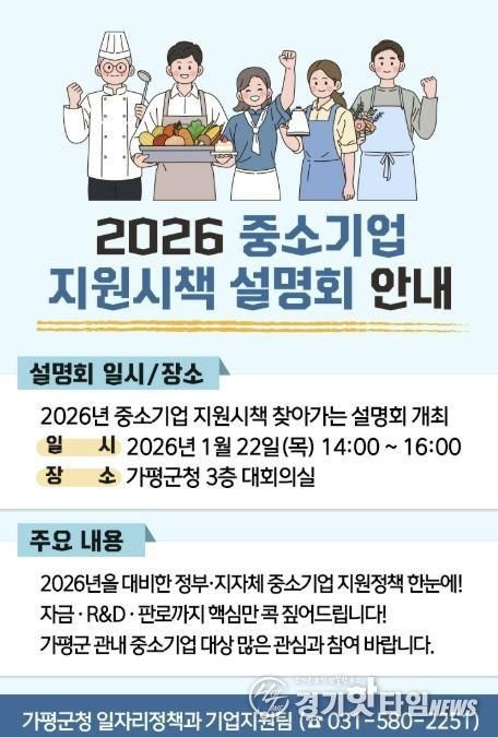 [경기핫타임뉴스=김형철 기자] 가평군이 관내 중소기업의 경영 안정과 경쟁력 강화를 위해 새해 정부의 지원시책을 한자리에 모아 안내하는 설명회를 연다.