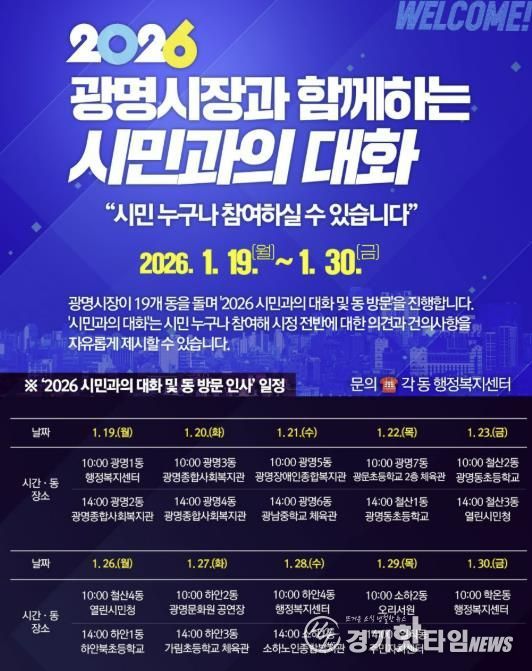 한편, 구체적인 방문 일정은 ▲19일 오전 10시 광명1동, 오후 2시 광명2동 ▲20일 오전 10시 광명3동, 오후 2시 광명4동 ▲21일 오전 10시 광명5동, 오후 2시 광명6동 ▲22일 오전 10시 광명7동, 오후 2시 철산1동 ▲23일 오전 10시 철산2동, 오후 2시 철산3동 ▲26일 오전 10시 철산4동, 오후2시 하안1동 ▲27일 오전 10시 하안2동, 오후 2시 하안3동 ▲28일 오전 10시 하안4동, 오후 2시 소하1동 ▲29일 오전 10시 소하2동, 오후 2시 일직동 ▲30일 오전 10시 학온동이다.