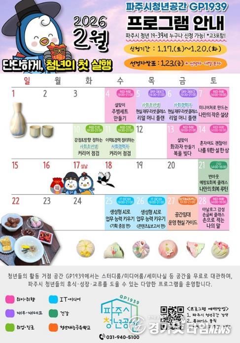 [경기핫타임뉴스=김형철 기자] 파주시청년공간 지피(GP)1939가 오는 2월 한 달간 청년을 위한 맞춤형 프로그램에 참여할 참여자를 모집한다.