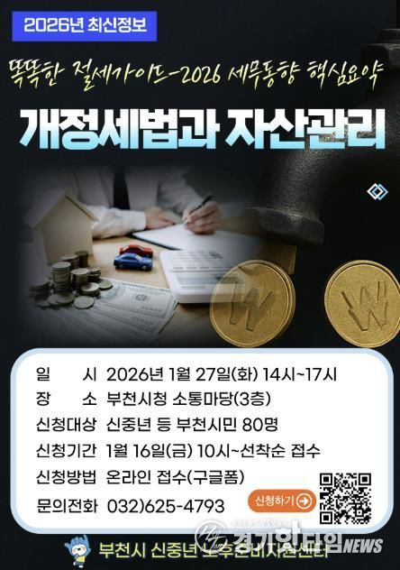 [경기핫타임뉴스=김형철 기자] 부천시는 1월 27일 시청 3층 소통마당에서 ‘2026년 개정세법과 자산관리’ 재무특강을 진행한다. 이번 특강은 오후 2시부터 5시까지 부천시민 80명을 대상으로 무료로 진행되며, 신중년의 자산관리 역량을 높이고 안정적인 노후설계를 지원하기 위해 마련됐다.