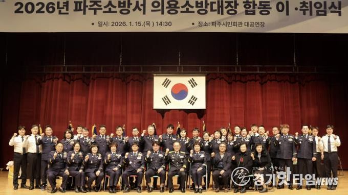 [경기핫타임뉴스=김형철 기자] 파주소방서는 1월 15일 파주시민회관 대공연장에서 『2026년 파주소방서 의용소방대 대장 합동 이·취임식』을 열고, 지역 안전을 위해 헌신해온 이임 대장들의 공로에 감사를 전하는 한편, 새로운 리더들과 함께 ‘의용’의 사명을 이어갈 뜻을 다졌다.
