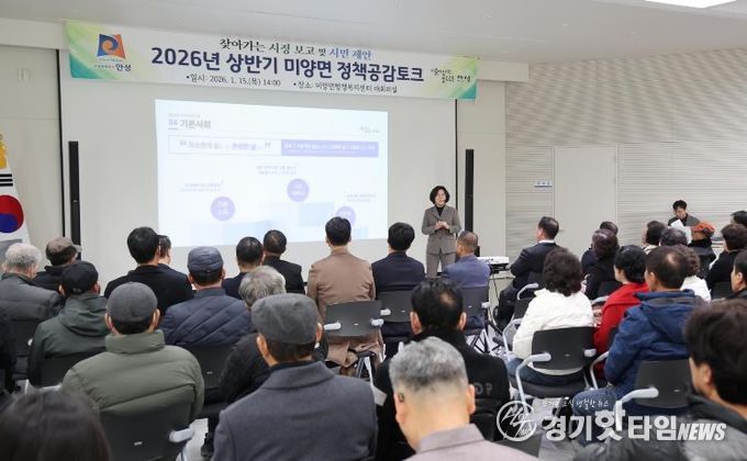 [경기핫타임뉴스=김삼영 기자] 안성시 미양면은 지난 1월 15일, 미양면행정복지센터 대회의실에서 주민 120여 명이 참석한 가운데 ‘2026년 상반기 미양면 정책공감토크’를 성황리에 개최했다.