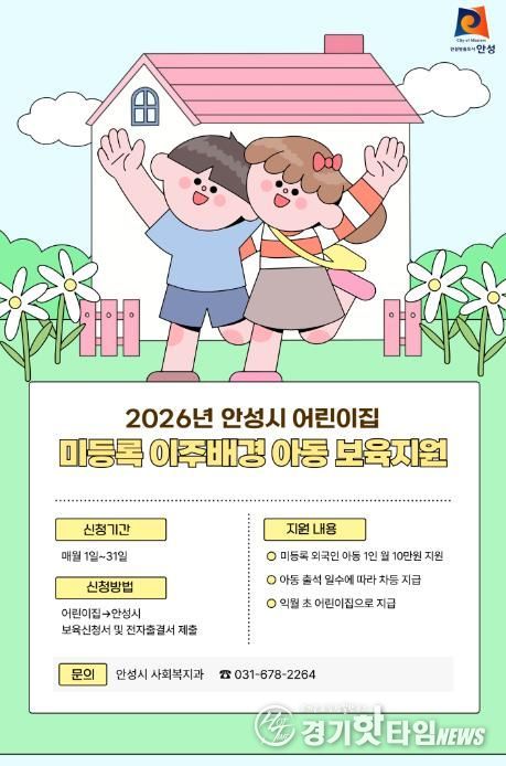 [경기핫타임뉴스=김삼영 기자] 안성시는 2026년부터 어린이집에 다니는 미등록 외국인(이주배경) 영유아에게 월 10만원의 보육지원금을 지원한다고 밝혔다.