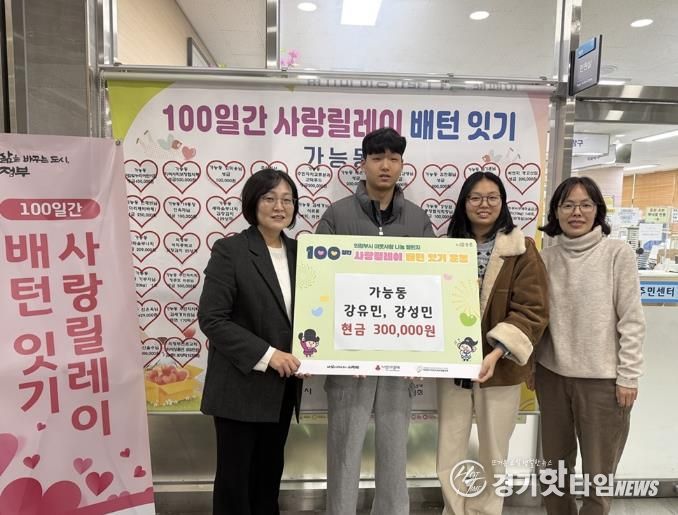 경민고에 재학 중인 강유민‧강성민 남매는 자신의 용돈을 모아 지난 3년 동안 가능동 주민센터에 기부를 이어왔다. 특히, 첫째 강유민 양은 올해 수능을 치르고 대학 입시를 준비하는 바쁜 시기에도 불구하고 지역 내 어려운 이웃을 잊지 않고 손수 성금을 기탁했다.