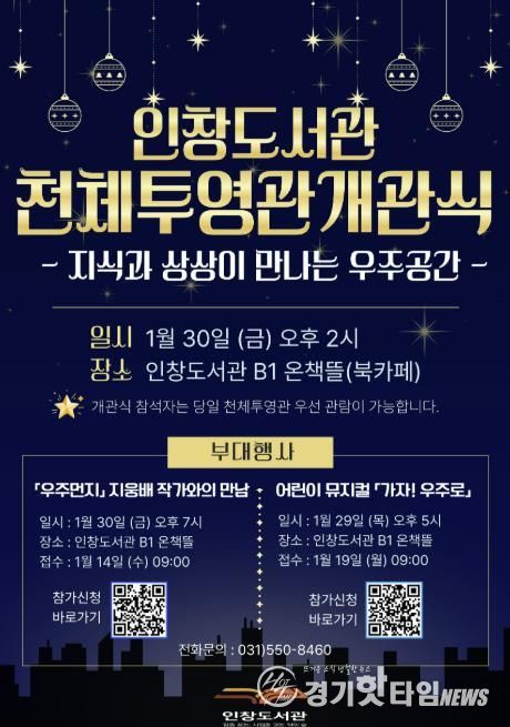 [경기핫타임뉴스=김형철 기자] 구리시는 오는 1월 30일 오후 2시 인창도서관 지하 북카페에서 주요 내빈이 참석한 가운데 4층 야외에 조성된 인창도서관 천체투영관 개관식을 개최한다고 밝혔다.