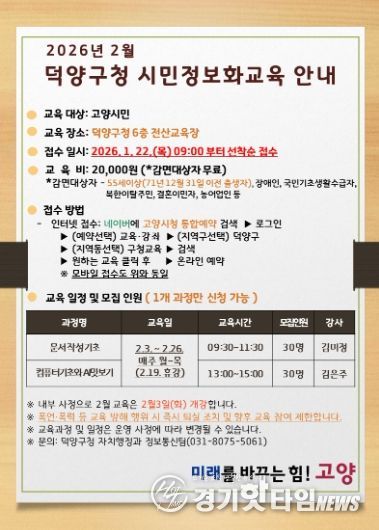 [경기핫타임뉴스=김형철 기자] 고양특례시 덕양구는 고양시민의 디지털 역량 강화를 위해 ‘2026년 제1차 덕양구 시민정보화교육’ 수강생을 오는 22일부터 모집한다고 밝혔다.
