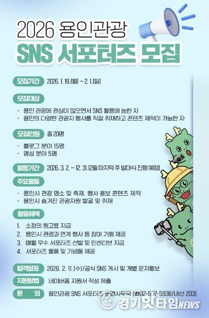 [경기핫타임뉴스=김삼영 기자] 용인특례시는 2월 1일까지 용인의 관광자원과 다채로운 축제·행사를 시민의 시각에서 생동감 있게 홍보할 ‘용인관광 SNS 서포터즈’를 모집한다고 20일 밝혔다.