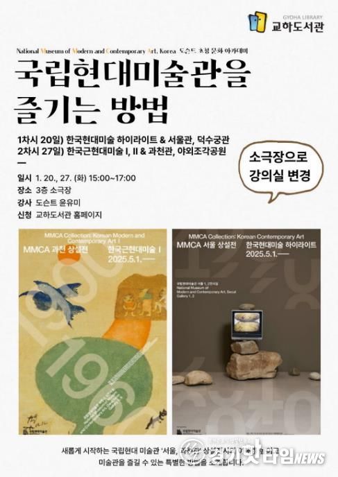 [경기핫타임뉴스=김형철 기자] 파주시 교하도서관은 오는 20일과 27일, 15시부터 17시까지 교하도서관 3층 소극장에서 전문 안내원(도슨트) 초청 강연 프로그램 ‘국립현대미술관을 즐기는 방법’을 운영한다.