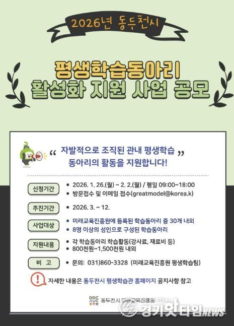 [경기핫타임뉴스=김형철 기자] 동두천시는 오는 1월 26일부터 2월 2일까지, 시민 주도형 평생학습 문화 확산을 위해 ‘2026년 평생학습 동아리 활성화 지원사업’에 참여할 학습동아리를 모집한다고 밝혔다.