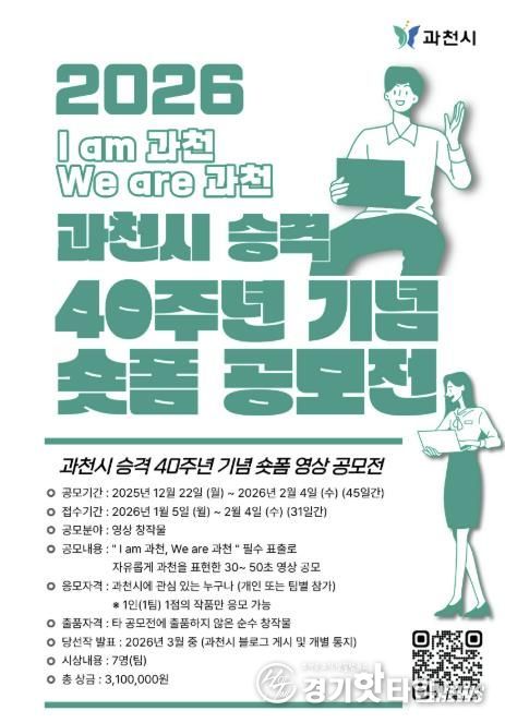 [경기핫타임뉴스=김삼영 기자] 과천시는 시 승격 40주년을 맞아 ‘숏폼 영상 공모전’을 개최하고, 오는 2월 4일까지 작품을 모집한다고 밝혔다.