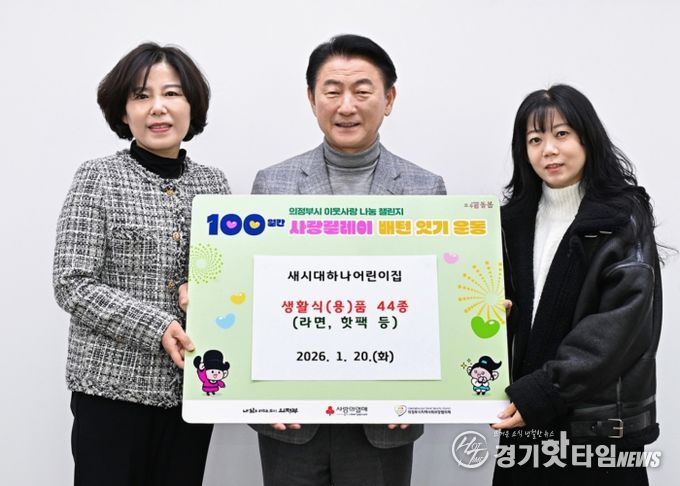 [경기핫타임뉴스=김형철 기자] 의정부시는 1월 20일 새시대하나어린이집이 ‘100일간 사랑릴레이 배턴 잇기’에 동참해 관내 저소득층을 위한 생활식(용)품 44종(라면, 핫팩 등)을 기부했다고 밝혔다.