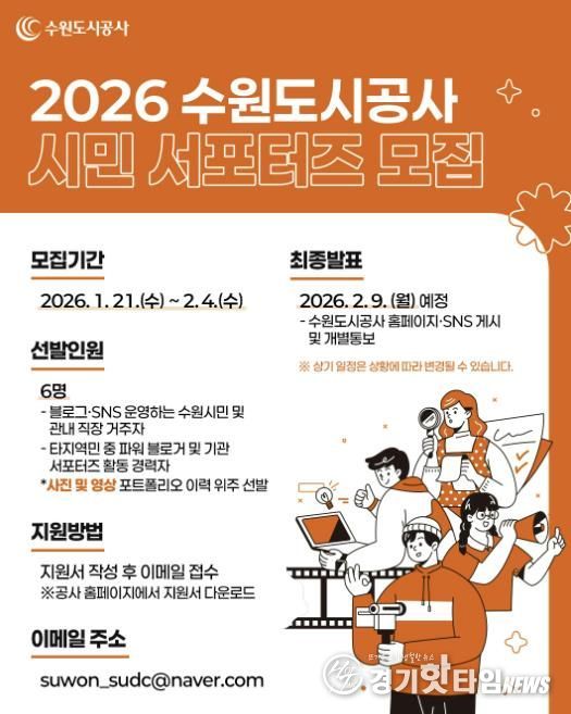 [경기핫타임뉴스=김삼영 기자] 수원도시공사가 21일부터 다음 달 4일까지 2026년도 제8기 시민 서포터즈를 모집한다.