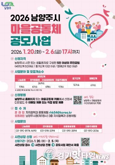 [경기핫타임뉴스=김형철 기자] 남양주시는 1월 20일부터 2월 6일까지 ‘2026년 마을공동체 공모사업’참여 공동체를 공개 모집한다.