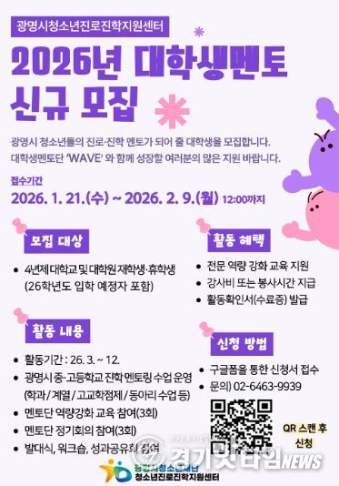 [경기핫타임뉴스=김삼영 기자] 광명시청소년재단 청소년진로진학지원센터는 관내 중·고등학교 청소년 대상 학과 멘토링 운영을 위해 ‘2026년 대학생 멘토단(wave)’을 모집한다고 밝혔다.