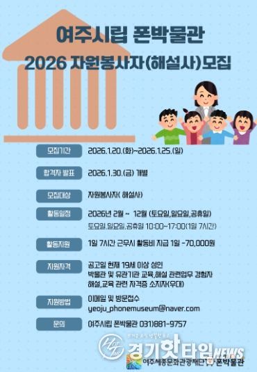[경기핫타임뉴스=김형철 기자] 여주세종문화관광재단은 여주시립 폰박물관의 전시 콘텐츠를 관람객에게 보다 쉽고 흥미롭게 전달할 자원봉사자(해설사)를 모집한다고 밝혔다.