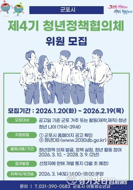 [경기핫타임뉴스=김삼영 기자] 군포시(시장 하은호)는 제4기 군포시 청년정책협의체 위원을 오는 2월 19일(목)까지 모집한다고 밝혔다.