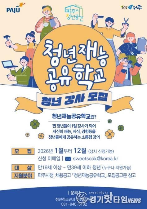 [경기핫타임뉴스=김형철 기자] 파주시는 2026년 1월부터 12월까지 청년을 대상으로 '청년재능공유학교' 청년강사를 연중 상시 모집한다.